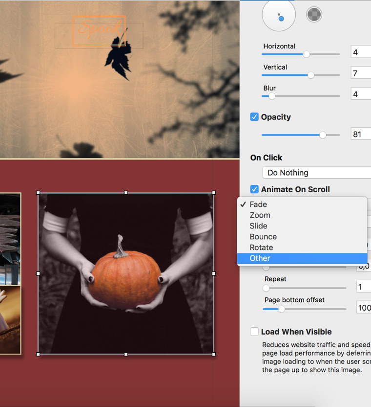 Las animaciones al desplazarse pueden aplicarse a imágenes, botones, cajas de texto y elementos de video. Activarás las animaciones mediante una casilla de verificación en la pestaña de estilo. Esto mostrará dos menús desplegables, uno para seleccionar la animación y otro para elegir la dirección y el tipo de movimiento. La última opción del primer menú, "otras", muestra una lista de animaciones poco convencionales, que podrían funcionar con Halloween. Debajo de la elección del estilo de animación están los controles de temporización, repetición y distancia.