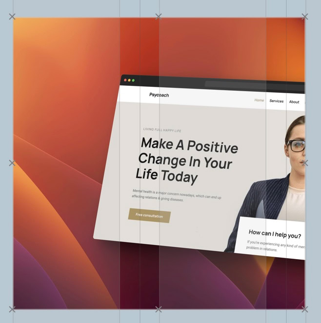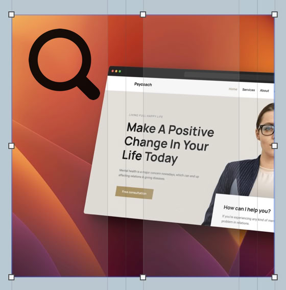 Ahora puedes ajustar celdas individuales de la cuadrícula para crear un aspecto más estético. Selecciona cada celda de la cuadrícula a su vez, ya sea directamente en el lienzo o desde el panel de capas. Asegúrate de seleccionar la celda de la cuadrícula y no la imagen en sí. La diferencia se puede ver a continuación. Los tiradores blancos del perímetro indican que se ha seleccionado la imagen. Las 'X' grises tenues indican que se ha seleccionado la celda.