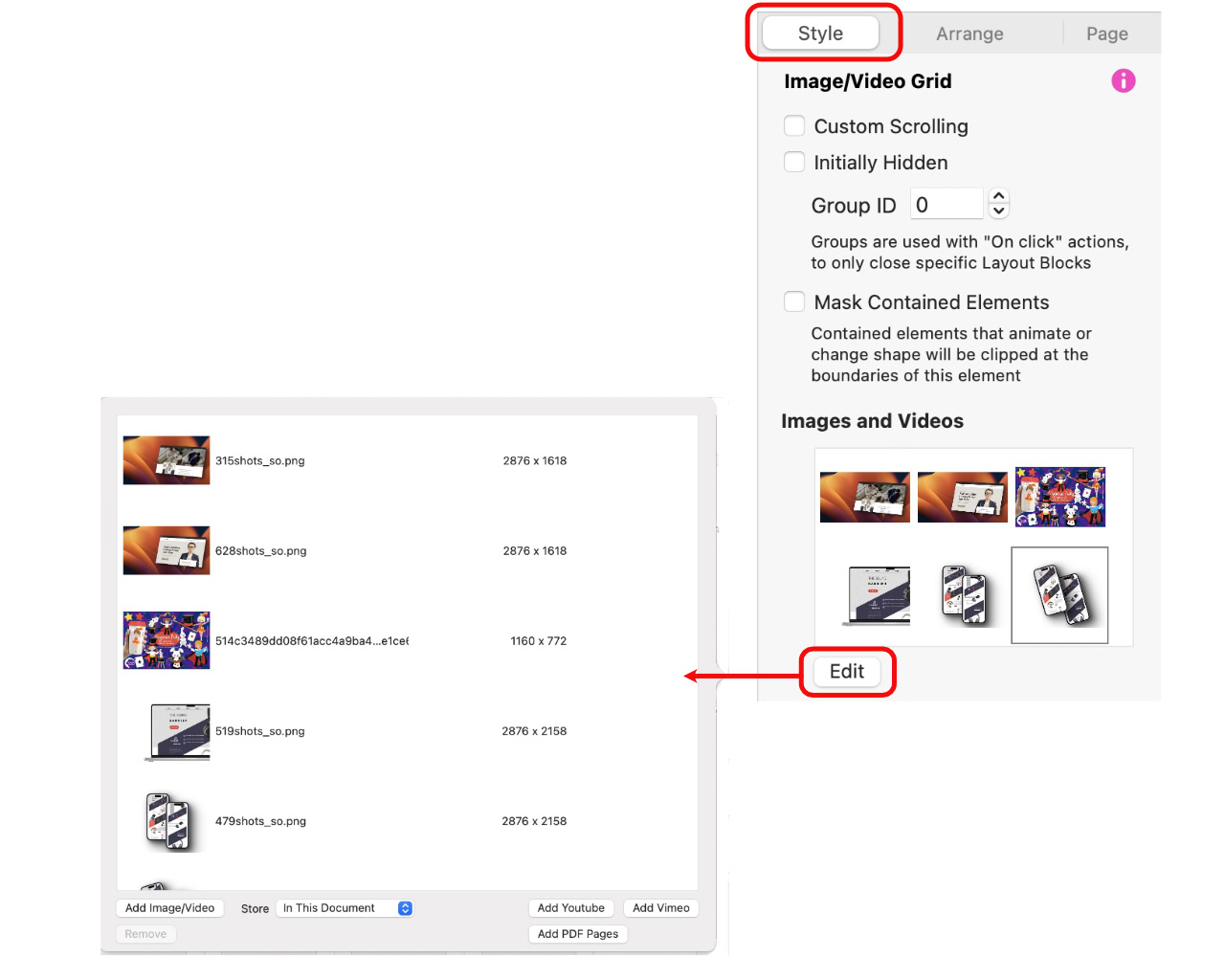 Empieza añadiendo el elemento a tu lienzo de Sitely y agregando el contenido de imágenes o vídeos. Esto se hace desde el panel de estilos mientras el elemento de Cuadrícula de Imágenes/Vídeos está seleccionado en el lienzo. La opción se ve así: