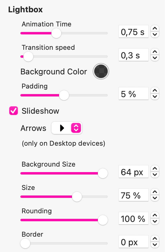 ¿Ves esas flechas de desplazamiento izquierda y derecha? Se añaden ajustando las opciones de presentación de diapositivas en el panel de estilos. Con la Cuadrícula de Imágenes/Vídeos seleccionada en el lienzo, asegúrate de marcar las opciones pertinentes para que esta función funcione. El panel de estilos revela muchas opciones para dar estilo a tu cuadrícula, a las celdas y al lightbox, así que asegúrate de revisarlas todas.