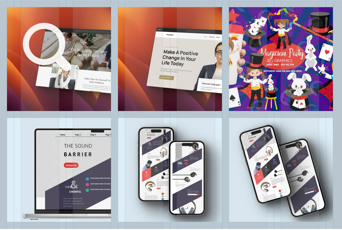 Esta técnica también se puede utilizar para mostrar un folleto PDF de varias páginas. Está claro que no quieres que los usuarios vean toda una cuadrícula de páginas individuales del folleto, así que, al hacer que las páginas adicionales desaparezcan efectivamente, acabarás con solo la portada del folleto, en la que los usuarios pueden hacer clic para leer la publicación completa. Del mismo modo, puede que tengas una gran cantidad de vídeos que quieres mostrar al mundo, pero no necesariamente quieres mostrar como una gran cuadrícula de vídeos individuales en la página. En ese caso de uso, normalmente crearías una gran imagen de póster del vídeo invitando a los usuarios a ver tu galería de vídeos. Esa imagen se configuraría como tu primera diapositiva grande, abarcando un mayor número de columnas de la cuadrícula. Esto mantiene tu página libre de desorden y, aun así, da a los usuarios acceso a toda una biblioteca de contenido en vídeo. Si quieres permitir la selección individual de vídeos y/o imágenes, puedes crear miniaturas más grandes y mantenerlas visibles en la página. Estas aparecerán en una o más filas bajo la imagen más grande en la página.
