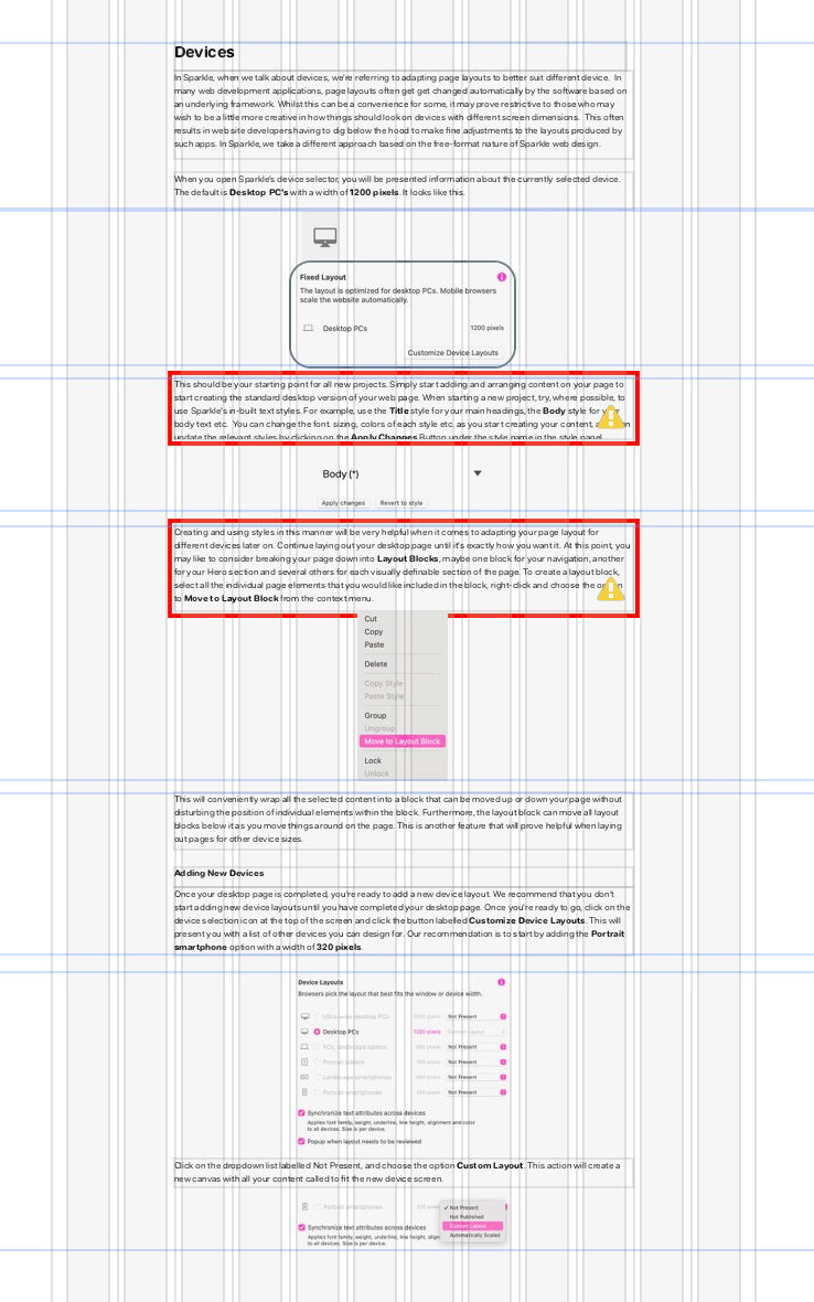 Todo el texto ahora se ha redimensionado a niveles legibles, pero los cuadros de texto deben redimensionarse para contener el texto recién ampliado. Esto se denota por los contornos rojos en los cuadros de texto. Estos indican que hay más texto en los cuadros de lo que se puede ver en la pantalla. Esto se corrige fácilmente con unas pocas maniobras simples.