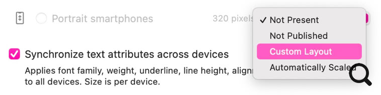 Una vez que tu página de escritorio esté terminada, estarás listo para añadir un nuevo diseño de dispositivo. Recomendamos que no empieces a añadir nuevos diseños de dispositivo hasta que hayas completado tu página de escritorio. Cuando estés listo, haz clic en el icono de selección de dispositivo en la parte superior de la pantalla y haz clic en el botón etiquetado "Customize Device Layouts". Esto te mostrará una lista de otros dispositivos para los que puedes diseñar. Nuestra recomendación es comenzar añadiendo la opción de smartphone en vertical con un ancho de 320 píxeles.