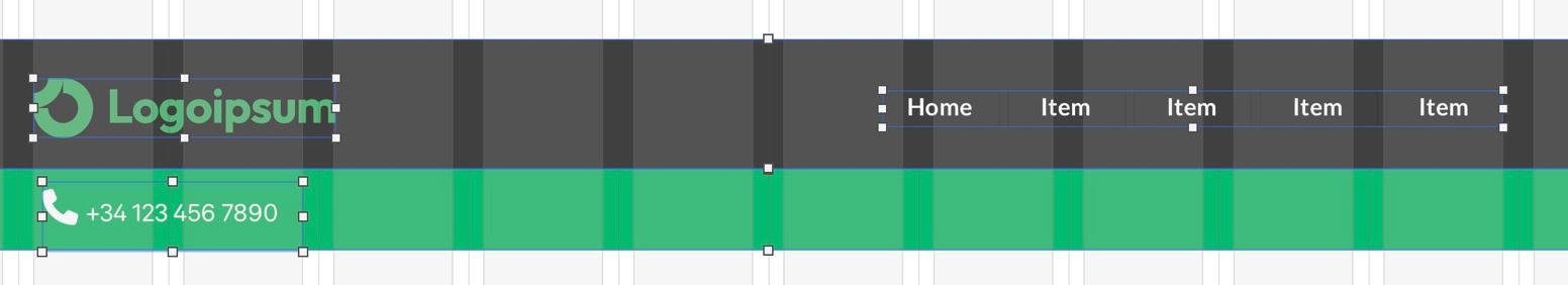 Los grupos se crean esencialmente cuando dos o más elementos se combinan en un único elemento. Por ejemplo, el elemento de navegación que se muestra a continuación es en realidad un grupo compuesto por dos cajas anchas para el fondo; un menú, para la navegación propiamente dicha; un número de teléfono; un icono; y un logotipo. Cuando todos los elementos se agrupan, toda la barra de navegación se convierte en un único elemento que puede colocarse en cualquier parte del lienzo.