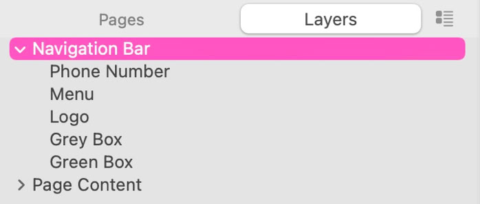 En el panel de capas, verás que al grupo se le ha asignado un nombre —«Barra de navegación» en este ejemplo— y que todos los elementos individuales se han organizado bajo el encabezado del grupo. Si el grupo está contraído, solo veremos el nombre del grupo, Barra de navegación, lo que facilita localizarlo y seleccionarlo.