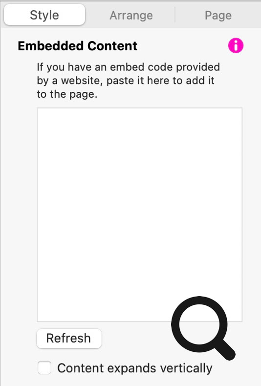 El siguiente fragmento de código que querríamos añadir a la página sería el que muestra el formulario de registro del script. Esto se añadiría al Body de nuestra página usando el elemento ‘Incrustar’. Esto creará un cuadro vacío en el lienzo de Sitely que podrás colocar donde quieras que aparezca el formulario de registro. Con el cuadro de incrustación seleccionado, ve al panel de estilos y añade tu fragmento de código. La opción se ve así: