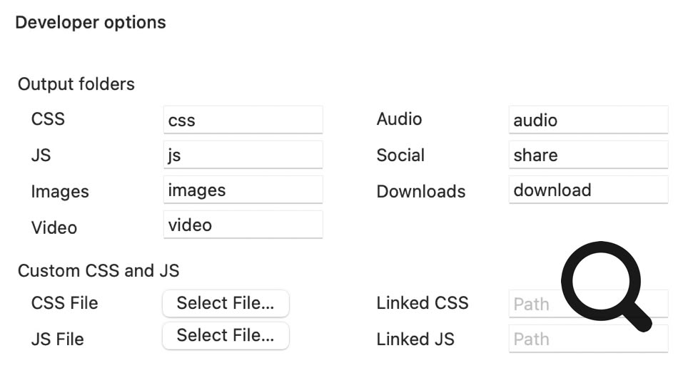 Además de las opciones específicas de cada página descritas arriba, también puedes añadir elementos de desarrollo a nivel de sitio a tu web mediante la opción Desarrollador en el panel de configuración. Aquí puedes especificar las carpetas de salida para los distintos elementos que añadas a tu página, incluidas hojas de estilo (CSS) y archivos de Javascript (JS). Además, puedes añadir archivos personalizados, ya sea desde tu disco, o desde recursos alojados vinculados.