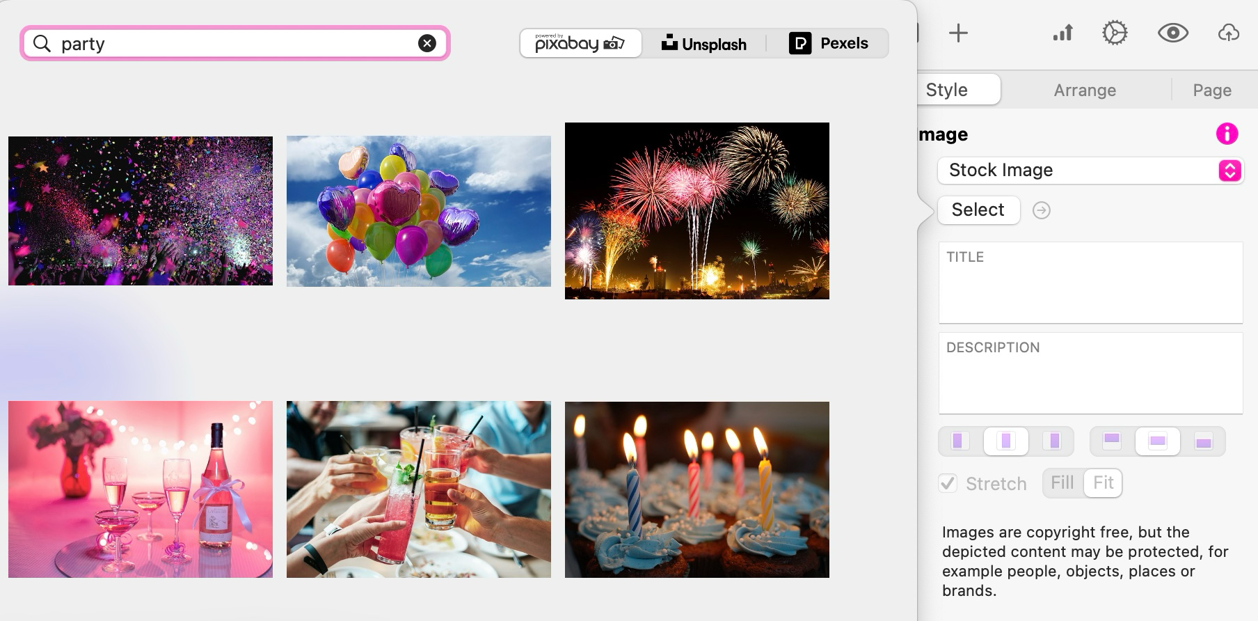 Esta opción te da acceso rápido a tres de las bibliotecas de imágenes de stock más populares de Internet: Pixabay, Unsplash y Pexels. Solo pulsa el botón ‘Seleccionar’, elige tu plataforma y comienza la búsqueda de la imagen perfecta.