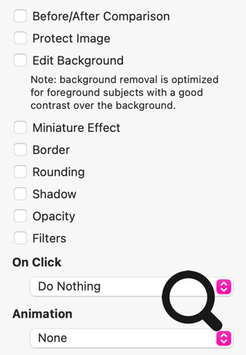 Todas figuran en el panel de estilos, como se muestra aquí. Al marcar las casillas de estilo se revelarán ajustes adicionales para cada opción. Además, podrás adjuntar cualquiera de las acciones al hacer clic de Sitely a tus imágenes, así como efectos de animación al desplazar o de una sola vez.