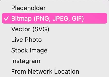 Al hacer clic en el botón ‘Añadir…’ podrás buscar una imagen en tu computadora. También tienes otras fuentes de imagen para elegir. Al hacer clic en el selector ‘Bitmap (PNG, JPEG, GIF)’ se mostrarán las fuentes disponibles.