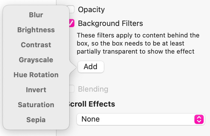 Estas opciones te permiten crear efectos interesantes, especialmente para imágenes a las que puedas estar aplicando efectos de desplazamiento. Estos filtros no cambian la imagen como tal, sino el fondo detrás de la imagen. Esto significa que la imagen debe ser parcialmente transparente o contener un área transparente (como en una imagen PNG) para que se vean los efectos. Para ver cómo funciona, se ha aplicado un filtro de Desenfoque a la imagen ‘Eye’ de la derecha. A medida que esta página se desplaza, la imagen se moverá hacia arriba y comenzará a superponerse con el contenido que hay encima. Cuando se superpone, el contenido detrás de la imagen se desenfocará. Hay varios efectos con los que puedes experimentar, así que pruébalos todos para familiarizarte con su funcionamiento.