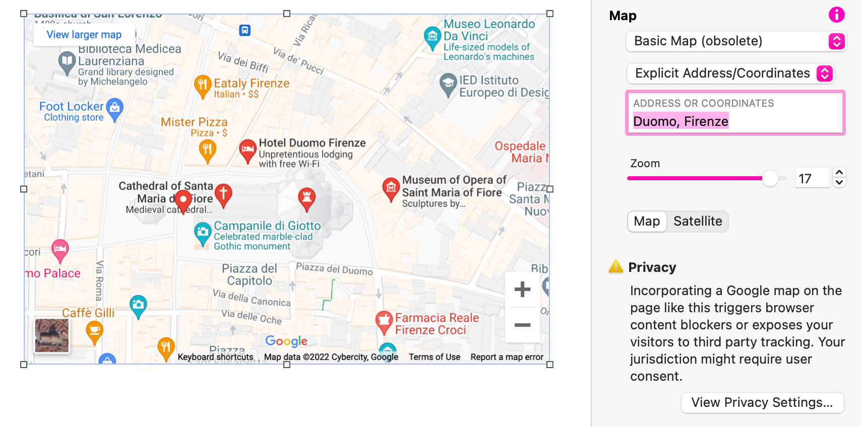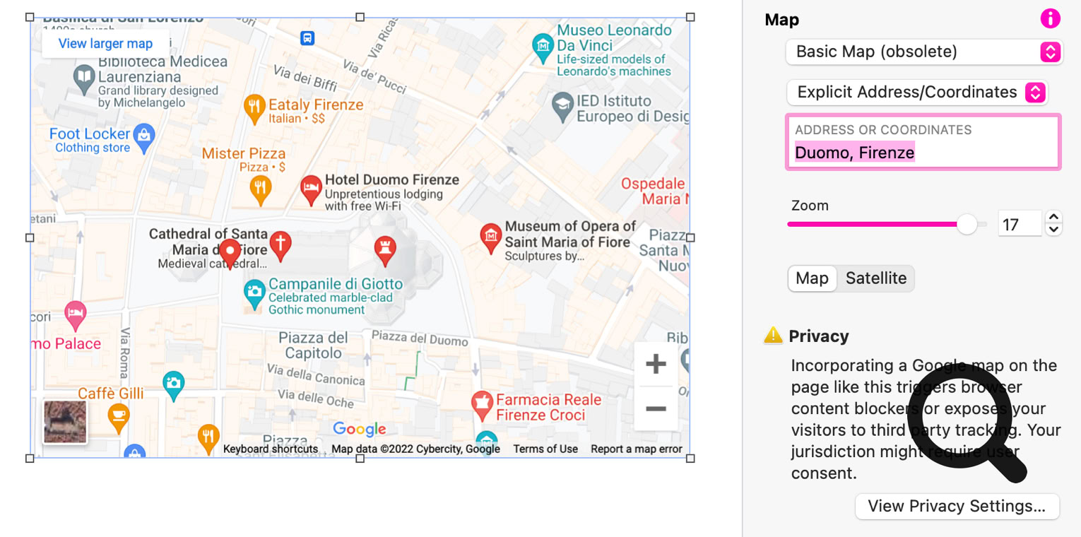 Sitely también ofrece una configuración de Google Maps heredada y obsoleta, que no requiere una clave de API. Google ha dejado de admitir su uso y podría no funcionar o dejar de funcionar en el futuro.