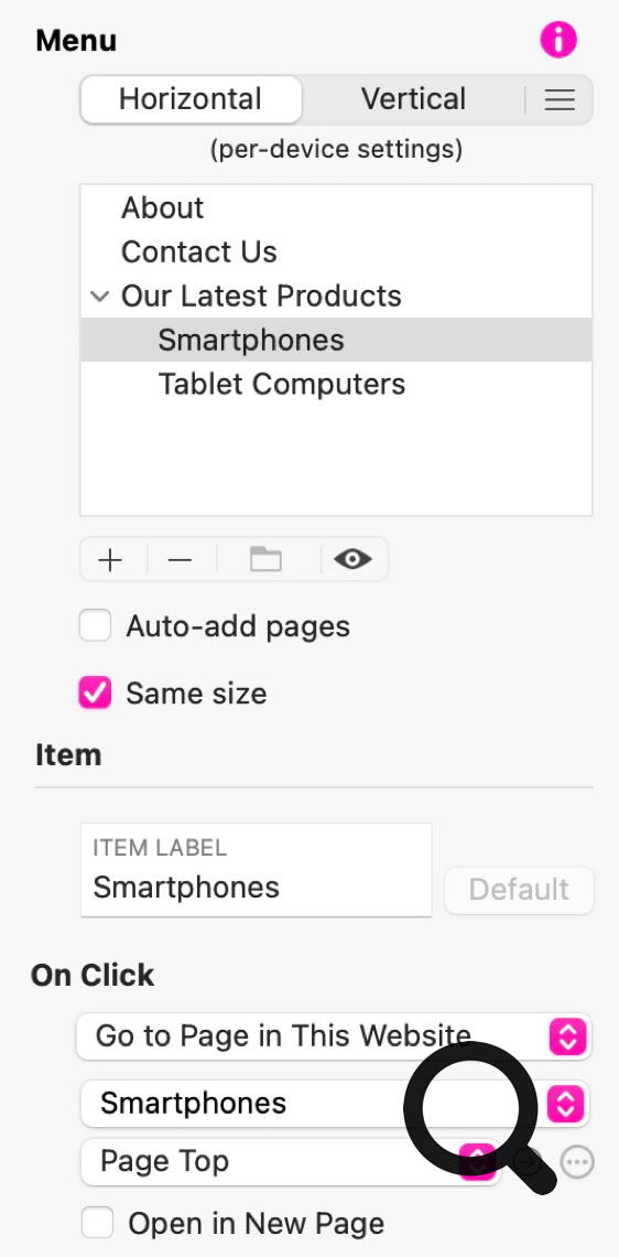 Si no quieres crear tus páginas y grupos de páginas desde el principio, puedes crear tu menú manualmente para tener un mayor control sobre tu estructura de navegación. Para ello, añade el elemento de menú al lienzo y desmarca la casilla Añadir páginas automáticamente en el panel de estilo. Entonces podrás añadir páginas y grupos manualmente.