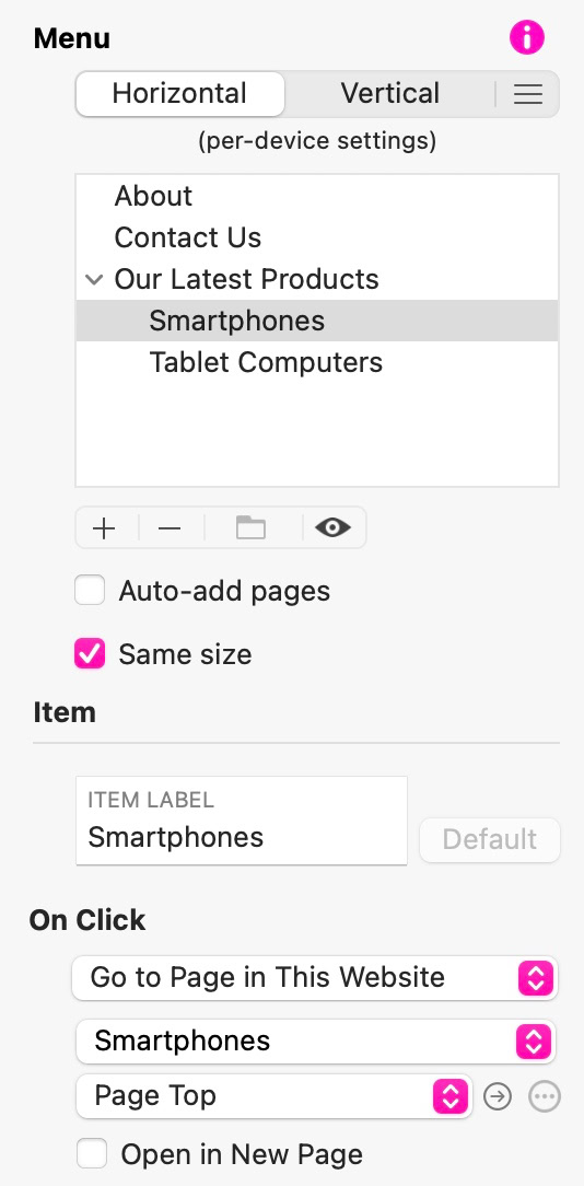 El enlace Inicio se crea automáticamente para ti y apuntará a la página de inicio, o página index.html, de tu sitio web. Para añadir un nuevo enlace de página, haz clic en el icono ‘+’ en la parte inferior del panel del menú. Esto creará un nuevo enlace llamado Elemento. Puedes cambiar la etiqueta del elemento en la casilla Etiqueta del elemento. Continúa añadiendo nuevos elementos de NIVEL SUPERIOR del mismo modo.