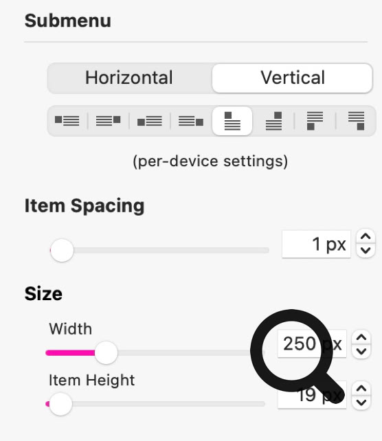 También hay una opción de espaciado de elementos que establece la cantidad de espacio entre los elementos del menú.