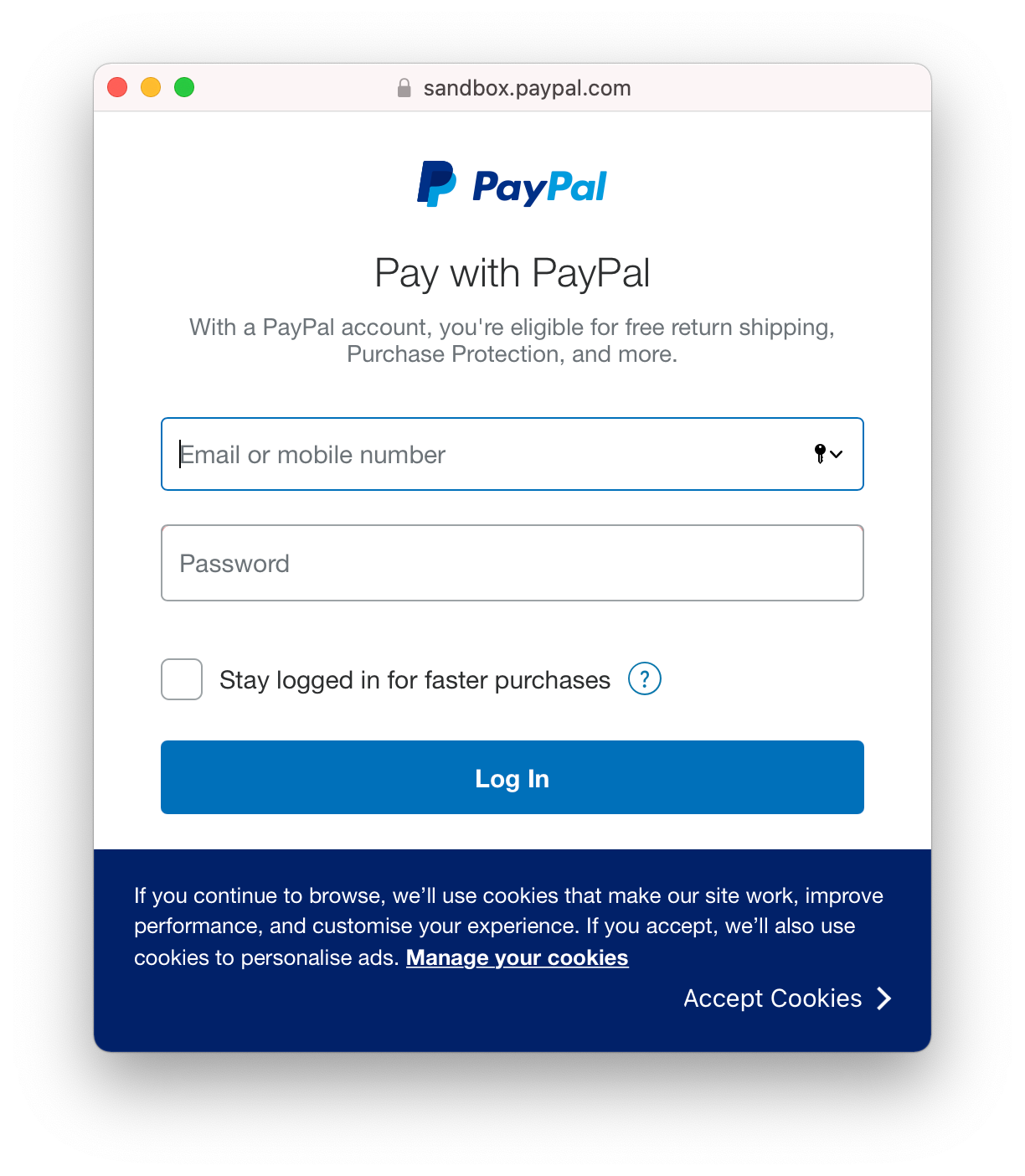 Cuando un cliente hace clic en un botón de compra de PayPal, la ventana de PayPal aparecerá sobre la página e incluirá un flujo de pago para el cliente, como este: