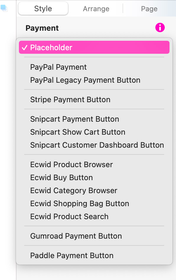 Puedes agregar un botón de pago a tu sitio desde el botón de la barra de herramientas “Agregar”, o desde el menú Insertar.