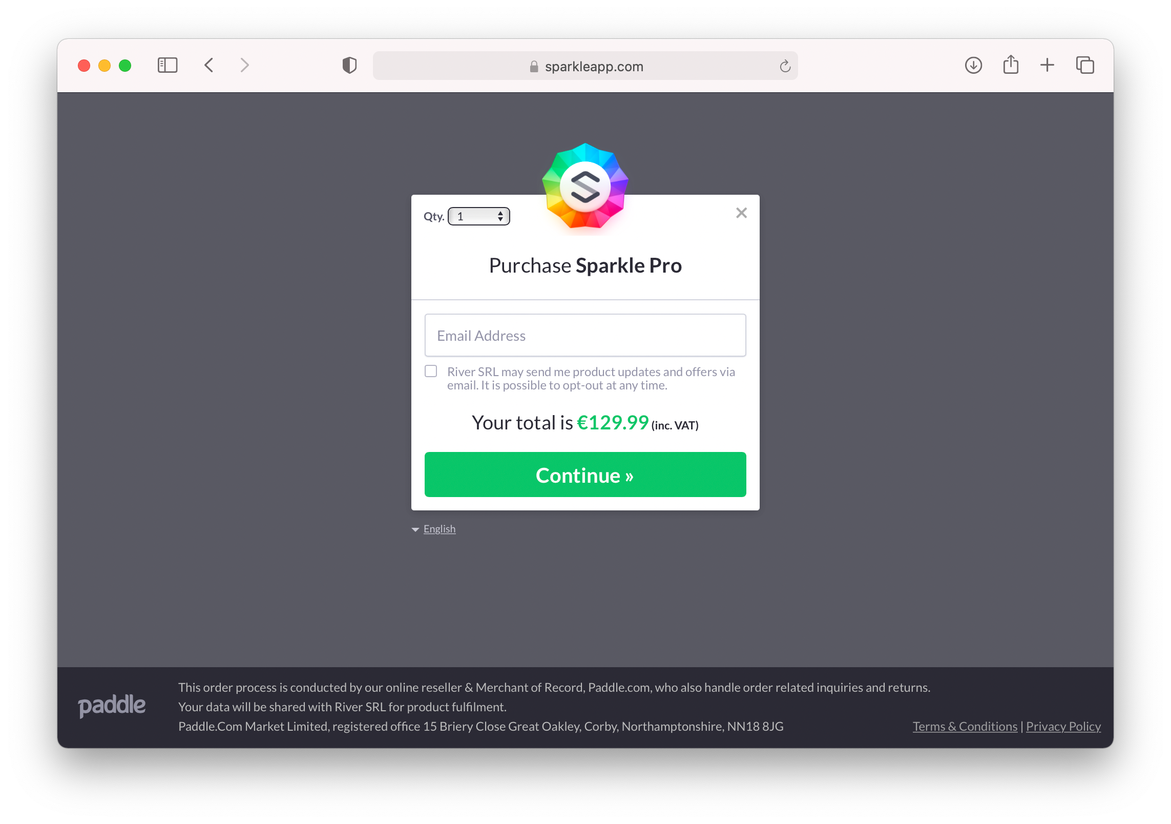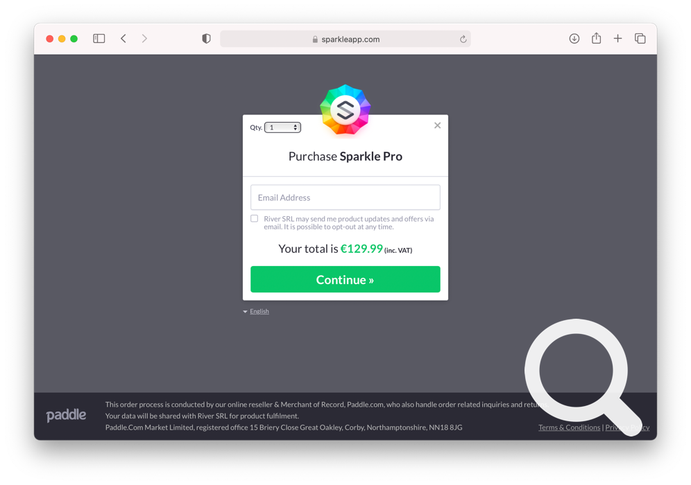Cuando un cliente hace clic en un botón de compra de Paddle, la superposición de Paddle aparecerá en la página e incluirá un flujo de pago para el cliente, como este: