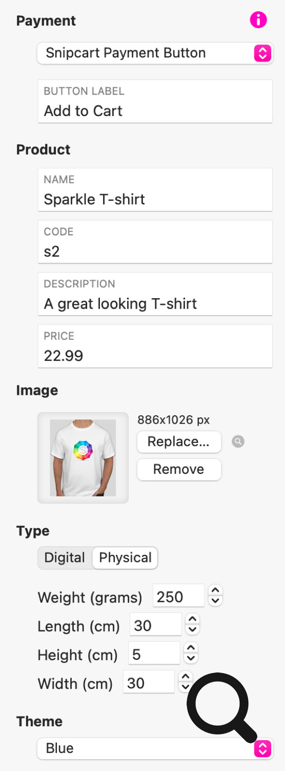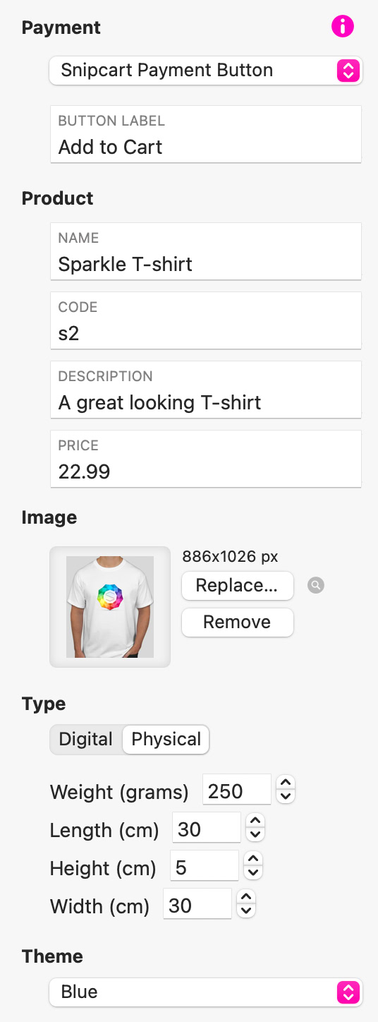 Cuando configuras el botón de pago en Snipcart, puedes personalizar todas las características y opciones del producto sin salir de Sitely.