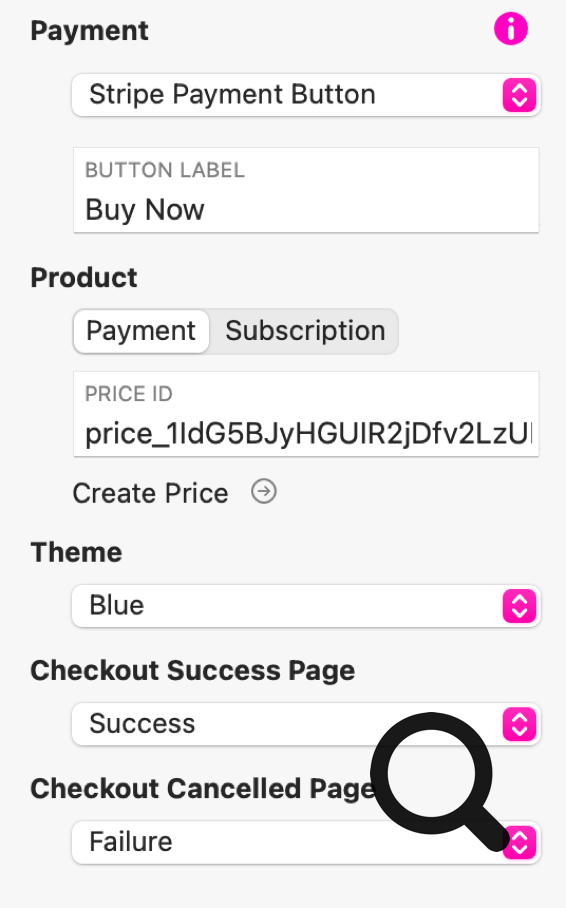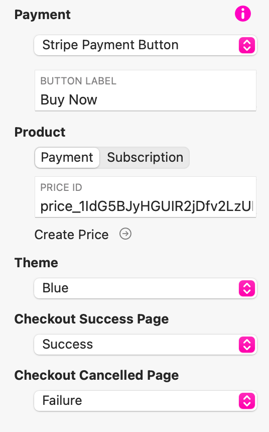 Cuando configuras el botón de pago en Stripe, puedes definir la etiqueta del botón, el tema de color y las páginas de éxito y de error.
