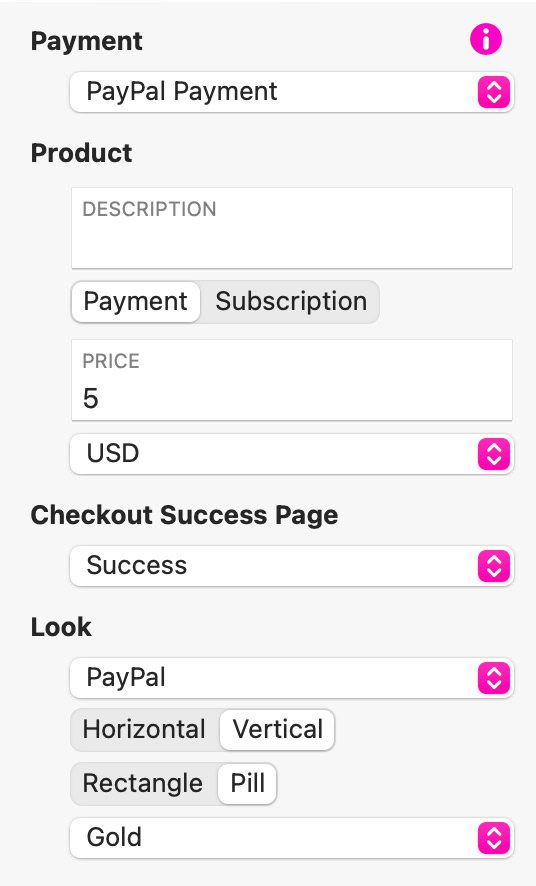 Puedes configurar el botón para aceptar un pago único directamente en Sitely, o vincularlo a un plan de suscripción configurado en el panel de control de PayPal.