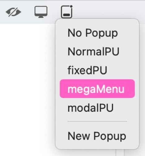 Esta es la ventana donde creas tu mega menú. Permanece fija a la barra del menú principal hasta que el usuario la cierra. Mientras tanto, la página se puede desplazar como de costumbre y la ventana emergente se mueve con la página.