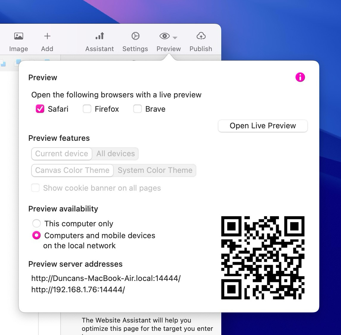 Sitely admite la vista previa en vivo en cualquier navegador y puede abrir directamente Safari, Firefox, Chrome, Brave y Edge. Si habilitas compartir la vista previa con otros dispositivos en la red local, también puedes usar la vista previa en vivo en dispositivos iOS, por ejemplo. El código QR ofrece una forma rápida de abrir la vista previa.