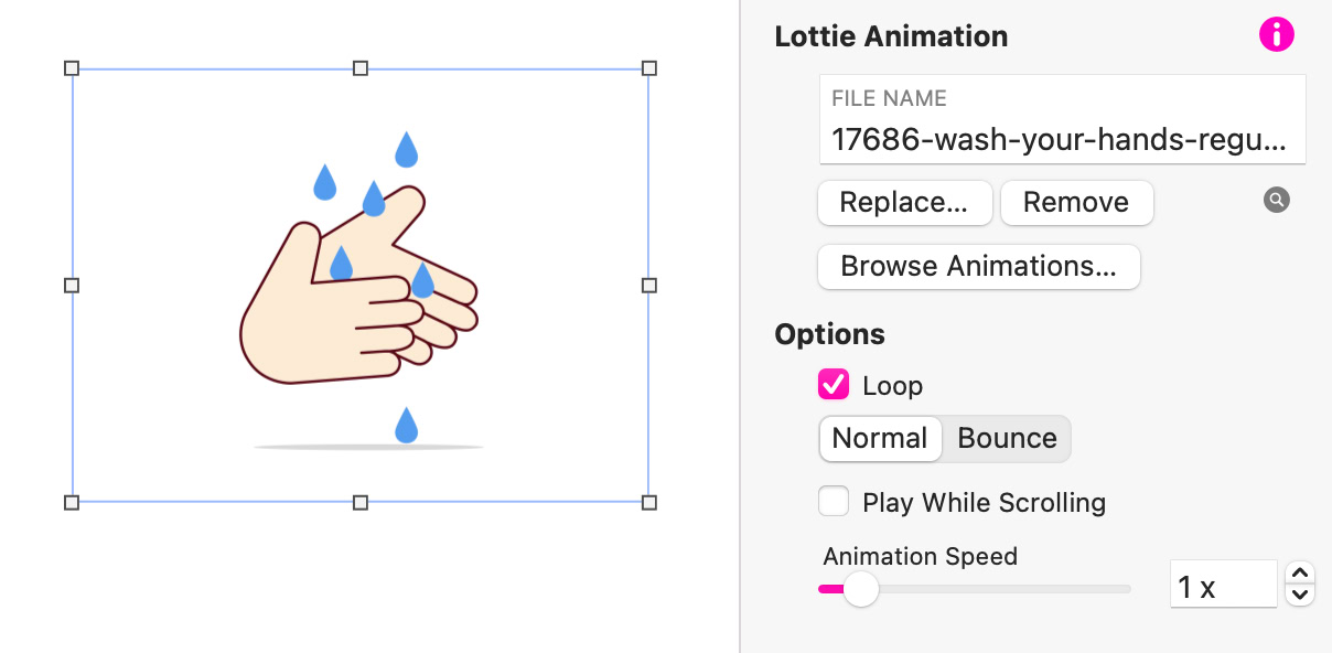 L'animation Lottie peut également être configurée pour se lire lors du défilement ; dans ce cas, le contrôle de vitesse devient un multiplicateur de vitesse, afin de déterminer comment le défilement influe sur l'avancement de l'animation.