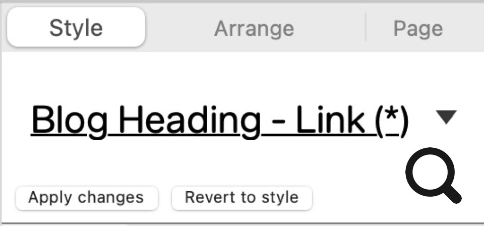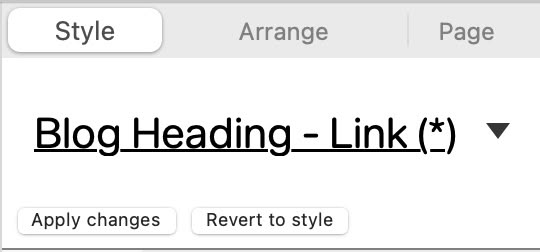 Le titre de l’article utilise un style de texte nommé Lien d’en-tête de blog. Si vous modifiez le style du titre, veillez à mettre à jour le style dans le panneau de styles en cliquant sur le bouton Appliquer les modifications. Cela garantira une apparence cohérente pour tous vos titres d’articles suivants.