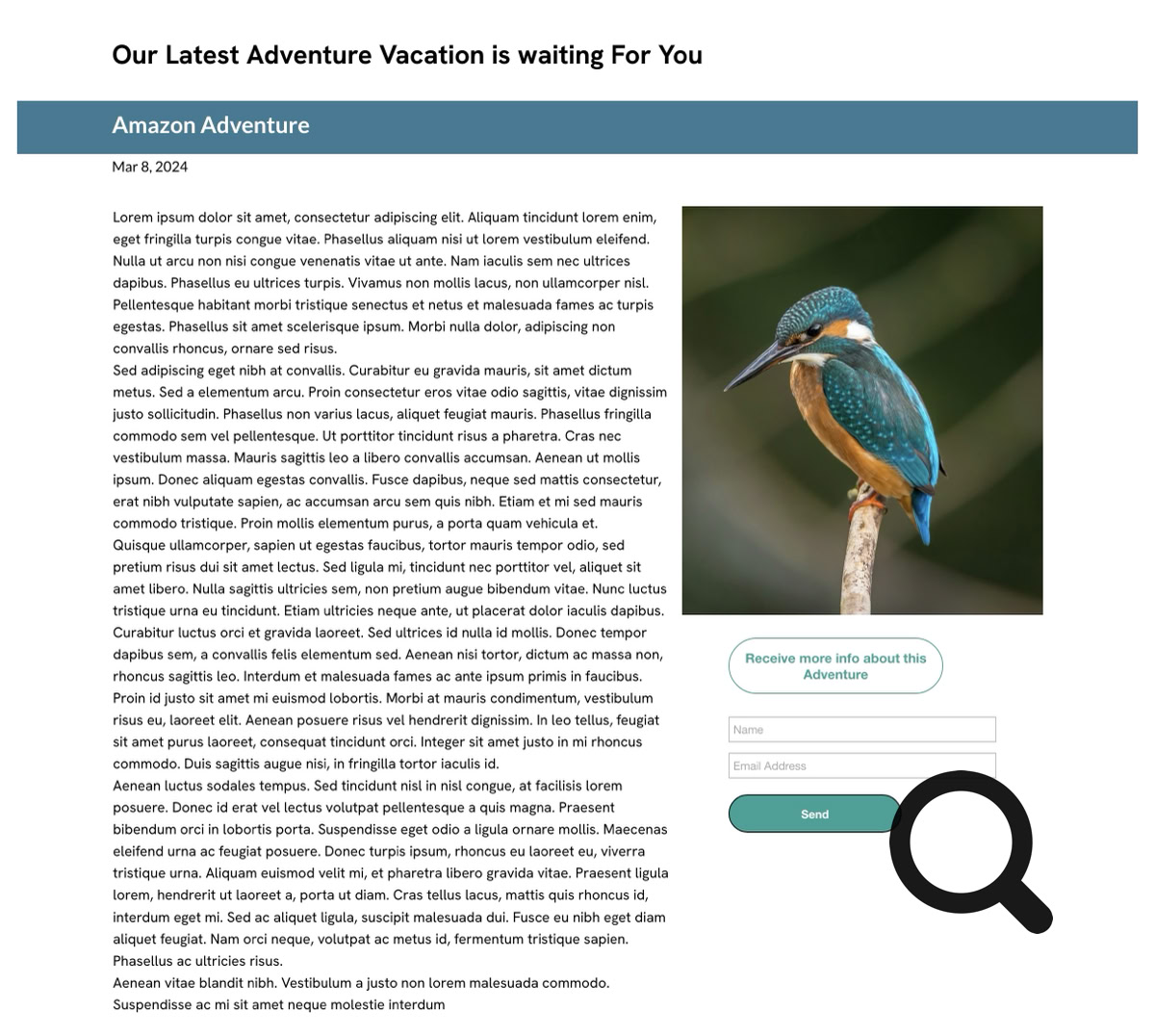Dans l’exemple ci-dessus, le titre du blog a été stylé et placé sur une boîte d’arrière-plan. Une image a été ajoutée, ainsi qu’un formulaire de demande rapide. Rappelez-vous, vous pouvez agencer votre page comme vous le souhaitez, comme n’importe quelle autre page dans Sitely. La seule chose supplémentaire que vous DEVEZ ajouter est un lien vers l’index du blog. Il peut s’agir d’un bouton ou d’un lien texte qui renvoie les utilisateurs vers la page d’index de votre blog. Généralement, le lien ressemblera à ceci et son action au clic sera définie sur Aller à l’index du blog.