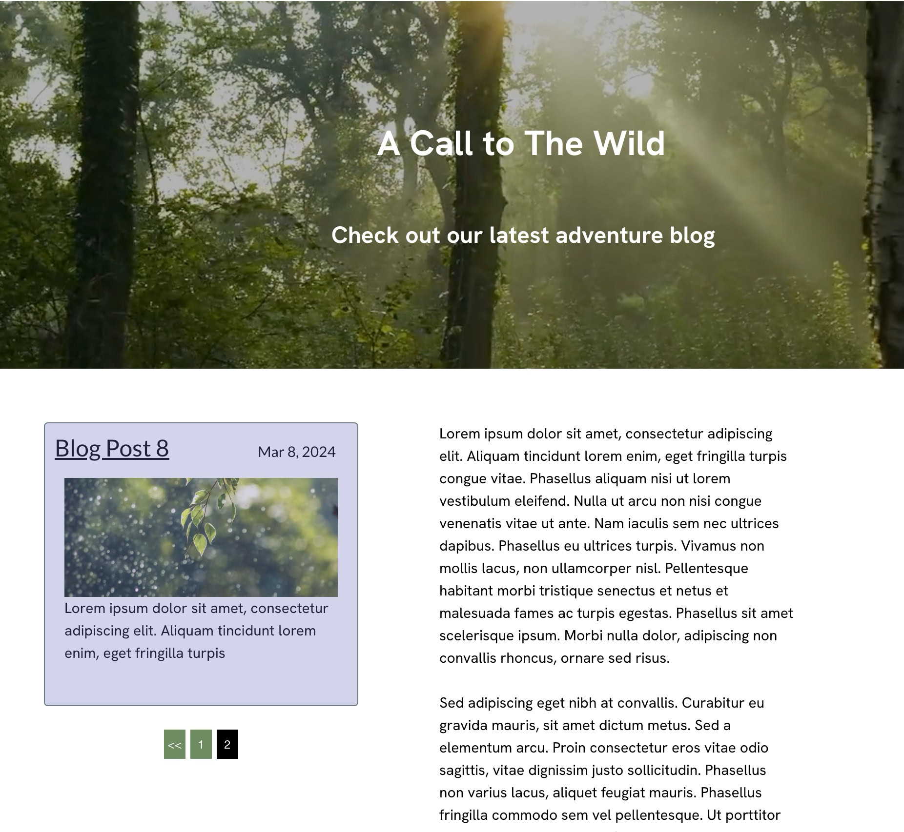 Par défaut, les liens de page sont affichés au centre de la page d’index. Si vous créez un index de blog destiné à s’inscrire dans une colonne plus étroite, vous pouvez déplacer et redimensionner le bloc de boutons de pagination pour qu’il se place directement sous vos résumés de blog, comme illustré ici.