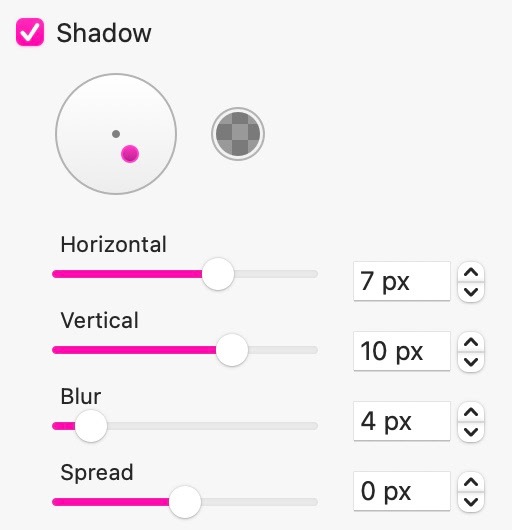 Ombre : cette option ajoute une ombre à votre boîte. Vous pouvez ajuster l’effet en déplaçant le petit point dans le cercle, ou plus précisément en saisissant des valeurs. La couleur de l’ombre peut être modifiée en cliquant sur le puits de couleur.
