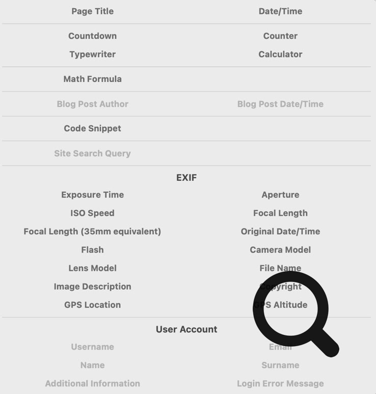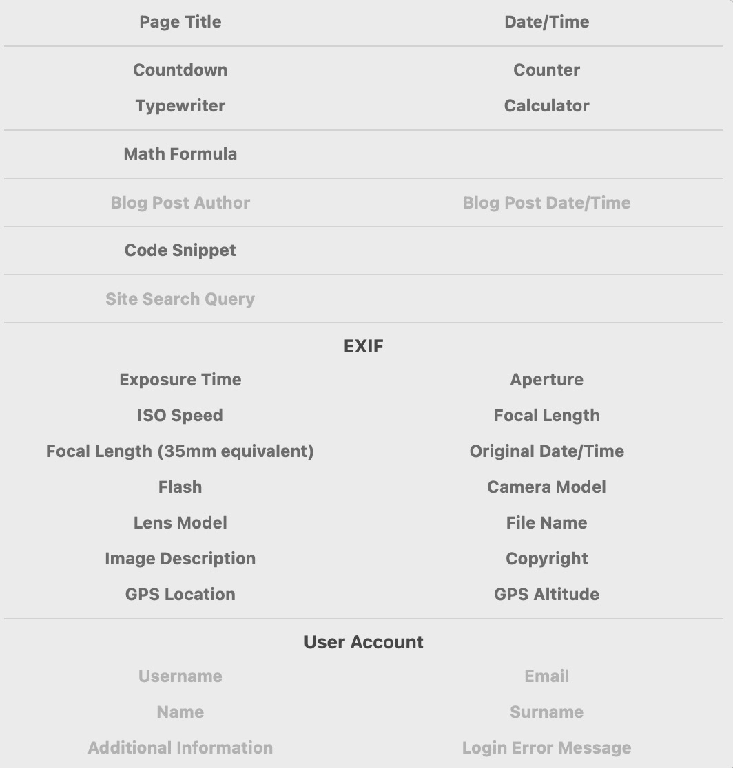 Les champs intelligents sont un outil polyvalent qui permet l’affichage dynamique de texte, utile dans de nombreux cas. Ils peuvent servir, entre autres, à afficher des informations de date/heure (p. ex., mise à jour automatique des mentions de copyright), à extraire les données EXIF d’une photo, ou encore à afficher des formules mathématiques ou des animations de texte.