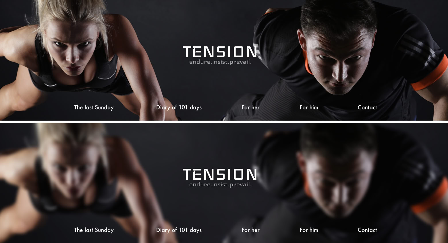 Si l’on met de côté ce problème toutefois, on peut noter plusieurs avantages. L’image comportait déjà de larges zones très sombres, ce qui fait des lettres blanches en gras un choix évident. Certaines parties cependant, comme le mot Diary sur le coude de la femme et le N de tension rencontrant les rayures blanches de la chemise de l’homme, sans nuire à la lisibilité du texte, paraissaient maladroites. Tout le texte est centré dans le cadre, donc le déplacer n’est pas une option idéale. Grâce au flou, ce n’est plus le cas.