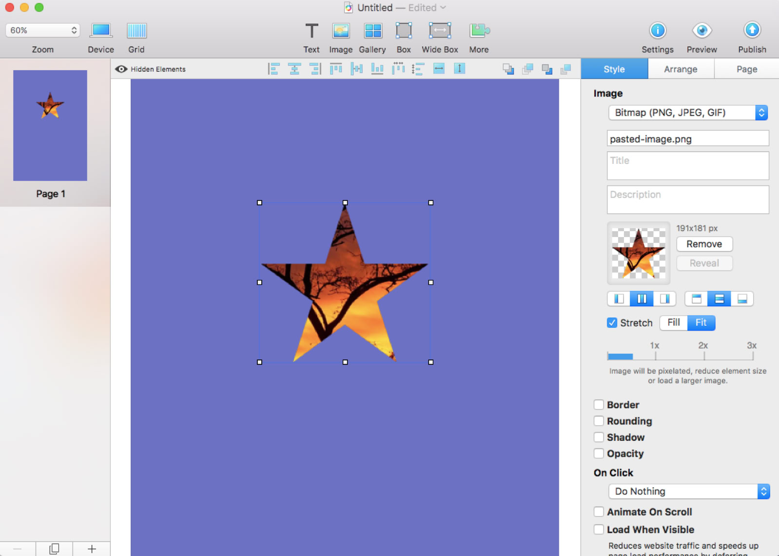 Il ne me reste plus qu’à copier-coller cette image masquée dans mon document Sitely. Toute image masquée que vous transférez conservera la même transparence que dans le document Pages. Ainsi, dans cet exemple, le fond violet que j’ai défini s’enroule autour des zones transparentes entourant la forme en étoile.