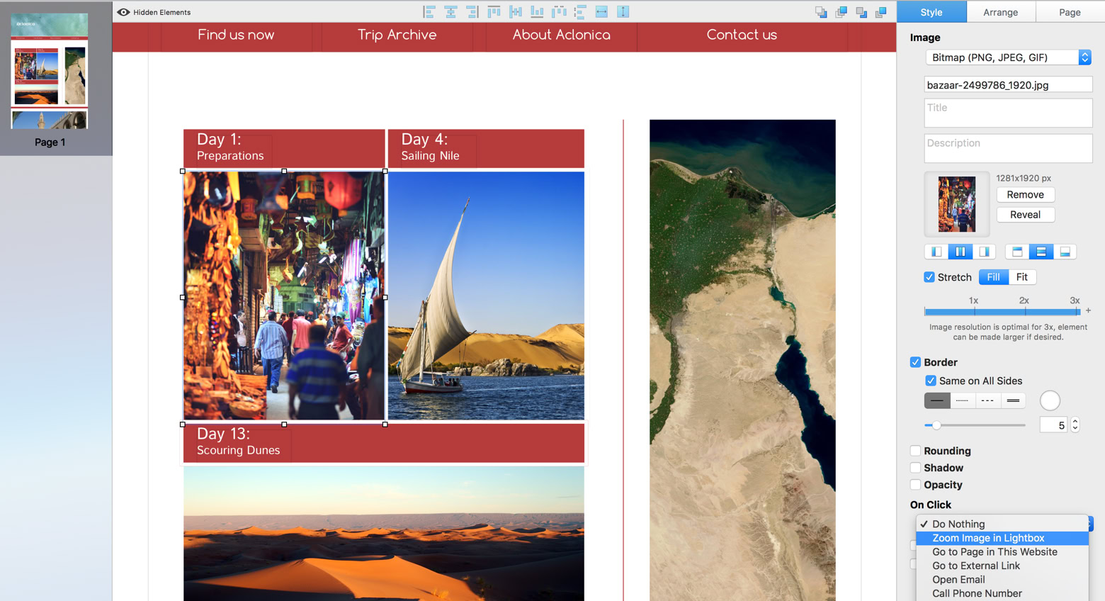 Pour ajouter un effet de lightbox, vous devez utiliser l’élément image, et non une boîte, car la boîte ne propose pas d’actions au clic. Ouvrez maintenant le menu déroulant Au clic et sélectionnez Zoomer l’image dans une lightbox.