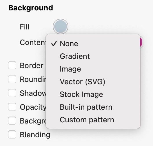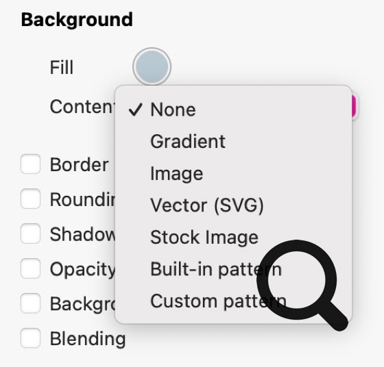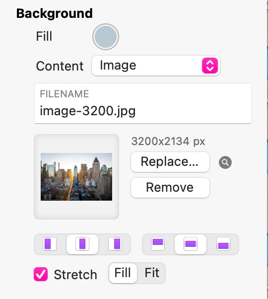 Vous ajoutez des images aux blocs disposition et aux boîtes larges dans la section arrière-plan du panneau de style. Vous serez présenté avec les mêmes choix que les boîtes d'images standard, plus quelques options de remplissage supplémentaires telles que les dégradés et les motifs.
