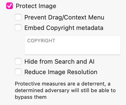 Ces deux techniques n'aideront pas avec des utilisateurs un peu plus sophistiqués, qui consulteront le code source de la page, ou des robots d'exploration qui téléchargent des images pour le compte de systèmes d'IA ou de services de recherche d'images. Donc, pour ceux-là, nous avons développé une nouvelle option "Cacher de la recherche et de l'IA", qu'il n'est pas impossible de contourner, mais qui nécessite un adversaire ciblé, techniquement compétent et qui veut spécifiquement votre image.