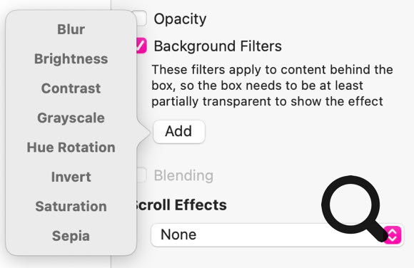 Ces options vous permettent de créer des effets intéressants, en particulier pour les images auxquelles vous appliquez des effets de défilement. Ces filtres ne modifient pas l'image en tant que telle, mais changent plutôt l'arrière-plan derrière l'image. Cela signifie que l'image doit être partiellement transparente, ou contenir une zone transparente (comme dans une image PNG) pour que les effets soient visibles. Pour voir comment cela fonctionne, un filtre Flou a été appliqué à l'image 'Œil' à droite. Au fur et à mesure que cette page défile, l'image montera sur la page et commencera à chevaucher le contenu au-dessus. Lorsqu'elle se chevauche, le contenu derrière l'image deviendra flou. Il existe un certain nombre d'effets avec lesquels vous pouvez expérimenter, alors essayez-les tous pour avoir une idée de leur fonctionnement.