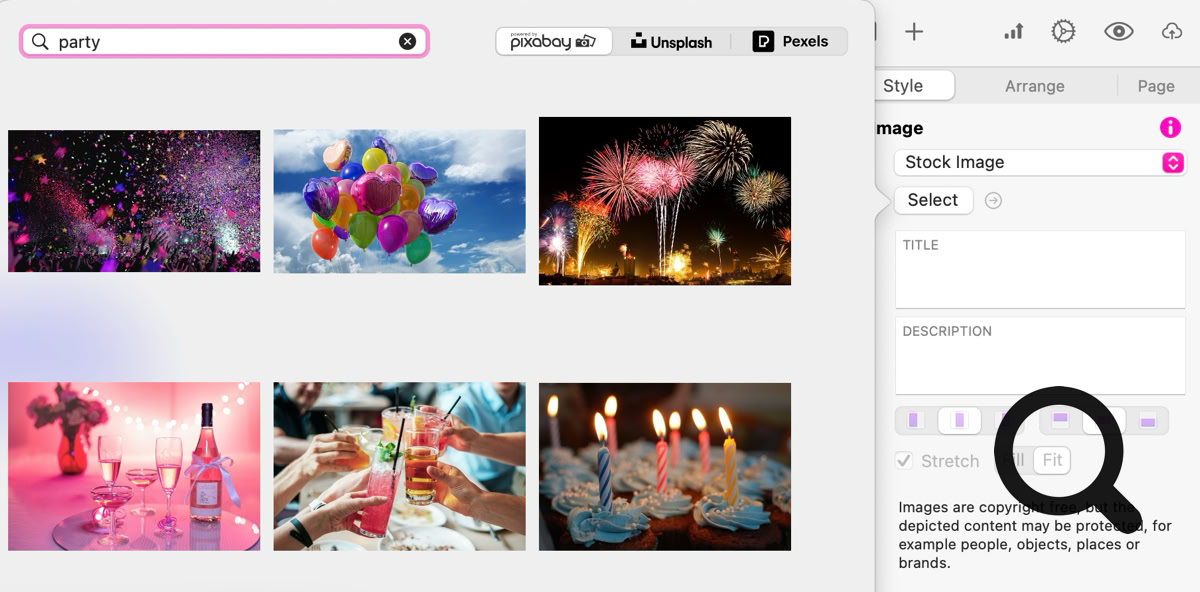 Remarque importante : Bien que les images de stock de ces plateformes soient généralement disponibles pour une utilisation sous des conditions de licence très libérales et sans frais, l'accès aux bibliothèques via l'interface de Sitely n'implique pas que les images peuvent être utilisées sans restriction dans toutes les situations - en particulier les images qui peuvent contenir des visages de personnes réelles ou des marques déposées. Il vous est conseillé de vérifier les conditions de licence spécifiques de toute image que vous utilisez sur le site Web de la plateforme concernée.