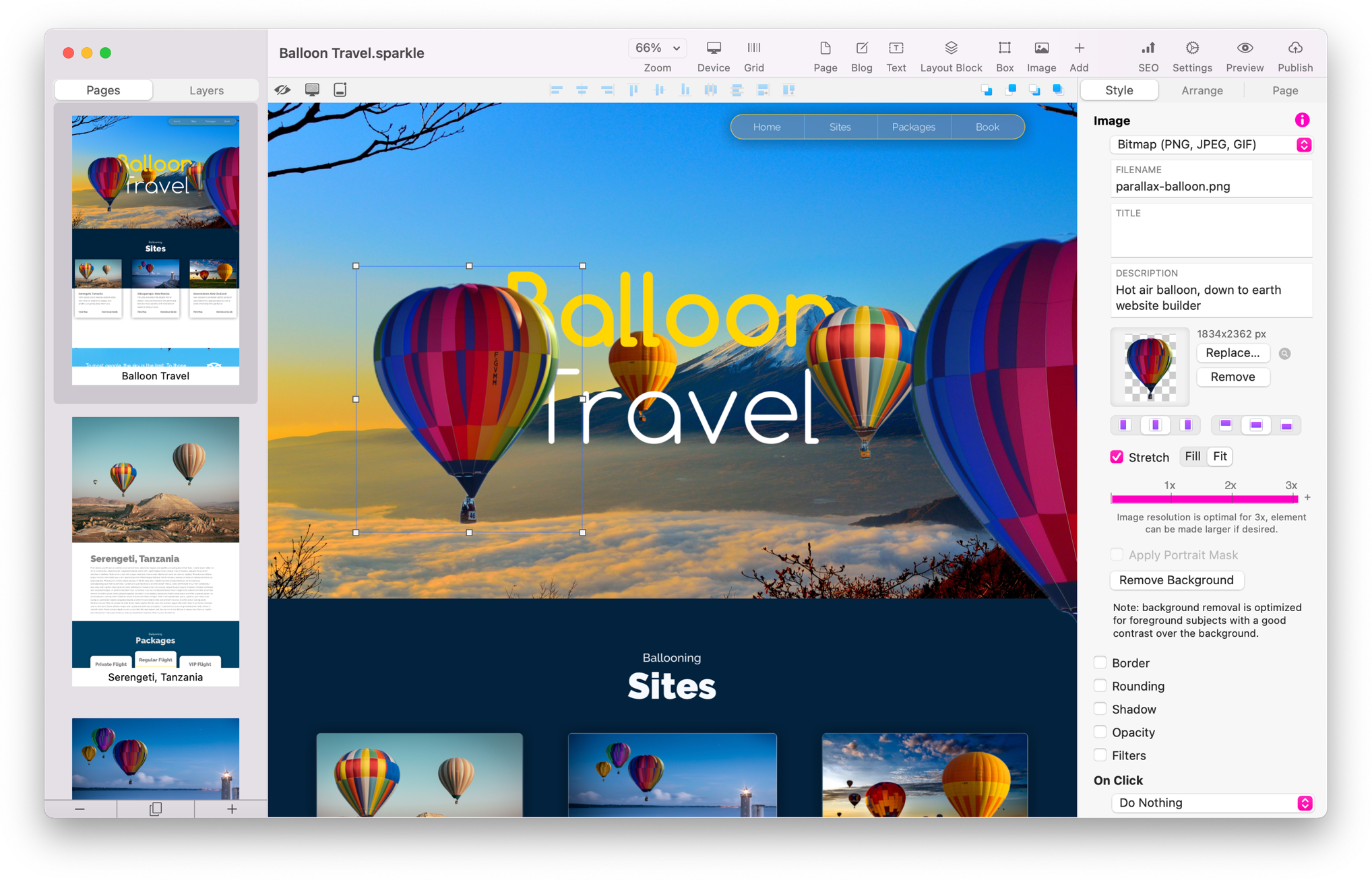 La page sélectionnée est affichée sur le canevas dans Sitely, une application WYSIWYG. Vous pouvez travailler interactivement sur les éléments en les sélectionnant, les déplaçant et les redimensionnant. Le zoom du canevas va de 25 % à 400 %, le comportement par défaut ajustant la largeur du document pour un redimensionnement facile. Bien que le défilement soit simple, un zoom avant peut entraîner un dépassement. Pour naviguer avec précision, maintenez la barre d'espace, saisissez le canevas et déplacez-le. Sitely affiche par défaut des boîtes de superposition, des lignes et des guides pour l'alignement, que l'on peut activer/désactiver avec la touche de tabulation pour désencombrer la vue.