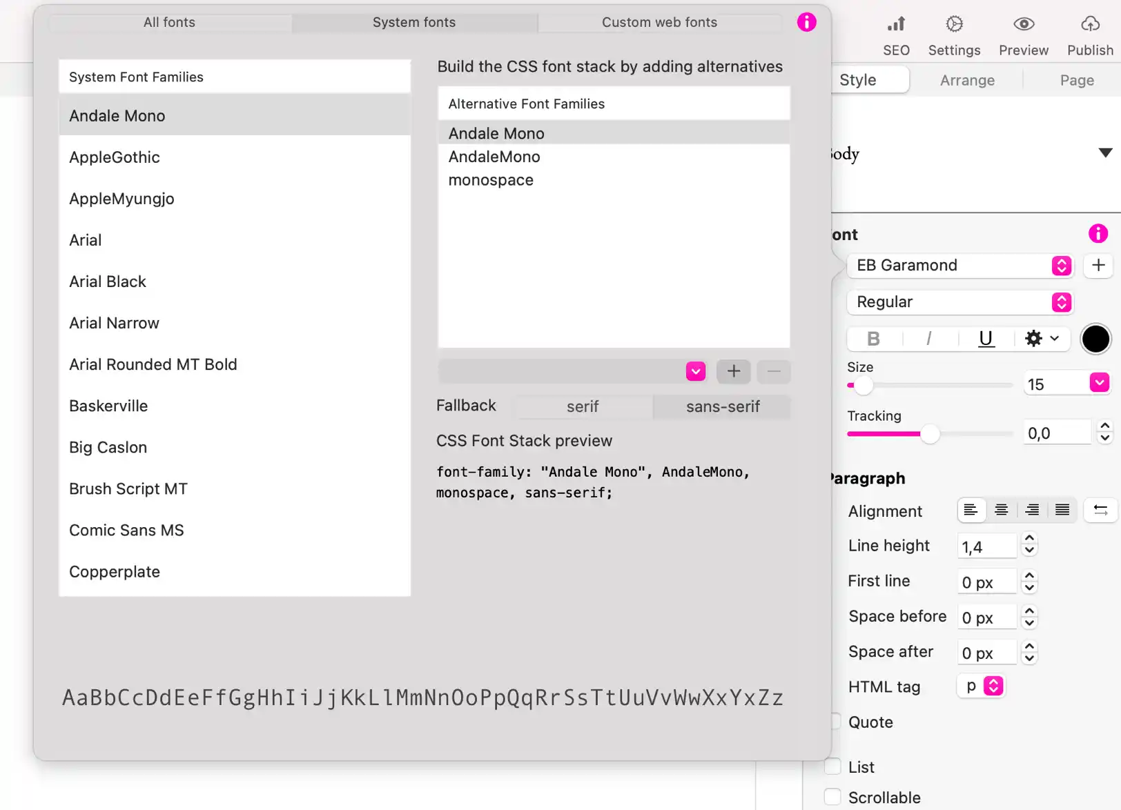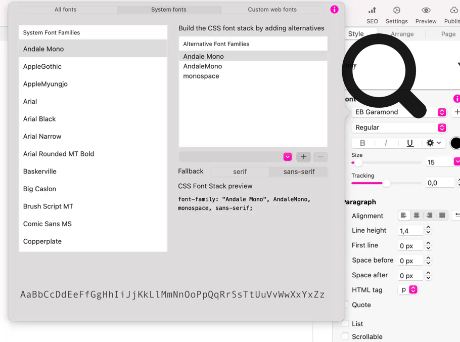 Le volet "Polices système" de Sitely offre un contrôle avancé sur le comportement du navigateur lorsque la police nommée n'est pas trouvée. C'est ce qu'on appelle une "pile de polices CSS", qui est une liste de polices répertoriées par ordre de préférence pour que le navigateur visiteur les charge comme alternatives jusqu'à ce qu'une soit trouvée.