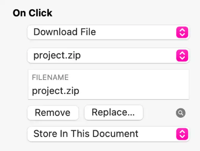 L'option Télécharger un fichier vous permet de choisir n'importe quel fichier sur votre Mac, tel qu'un PDF ou une archive ZIP, à proposer au téléchargement depuis le site Web. Le fichier sera publié avec le site Web et téléchargé à partir de là. Un raccourci pour créer un lien vers un fichier téléchargeable consiste à le faire glisser et à le déposer sur le canevas de Sitely, ce qui créera le lien de téléchargement.
