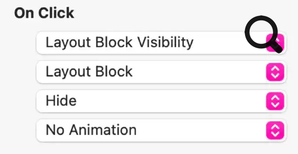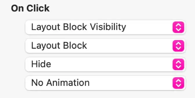 Bien qu'il faille généralement éviter de masquer du contenu sur une page, il existe des cas où vous avez une très grande quantité de contenu que vous souhaitez divulguer de manière sélective. Cette action peut afficher, masquer ou basculer la visibilité d'un bloc de mise en page, ou de plusieurs blocs disposition dans un groupe.