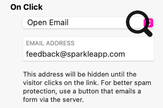 L'option Ouvrir un e-mail a un champ pour spécifier l'adresse du destinataire. Cliquer sur le lien résultant ouvrira un nouveau message dans votre client de messagerie par défaut ou redirigera vers une interface de messagerie Web. Si le spam est une préoccupation, une meilleure option est de créer un formulaire de contact.