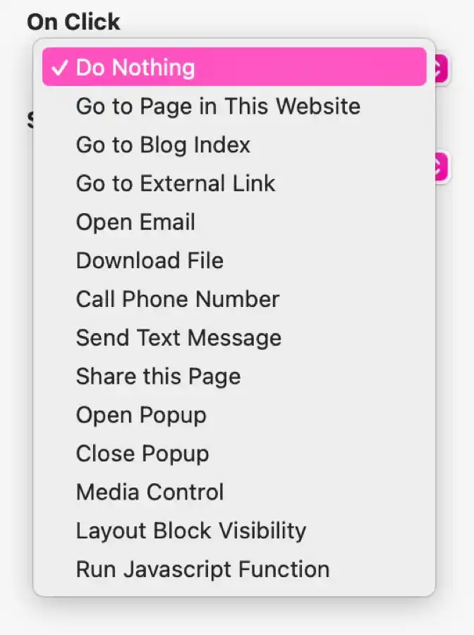 Par défaut, l'option est réglée sur "Ne rien faire", mais elle peut être réglée sur un certain nombre d'options, qui sont les mêmes pour tous les éléments qui ont l'action "Au clic". Les images et les boutons ont des options supplémentaires, consultez les pages de documentation respectives.