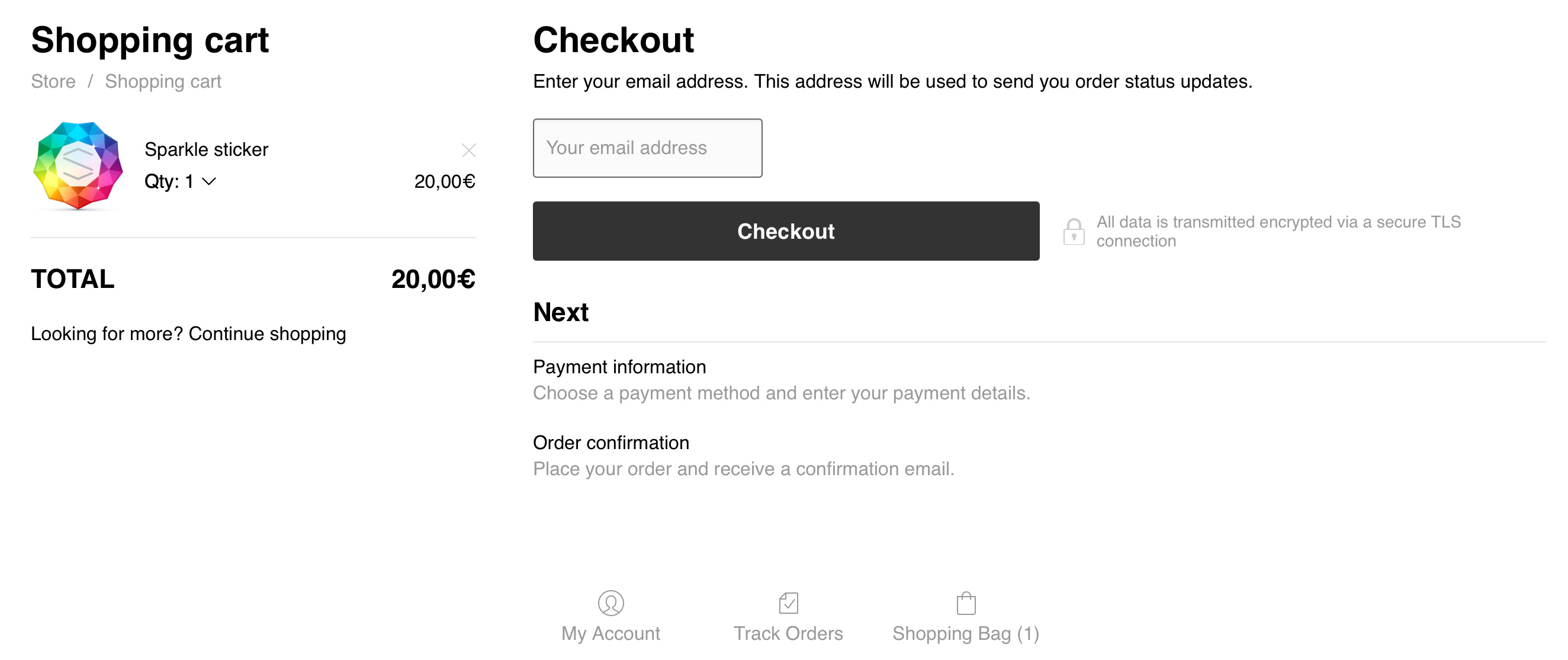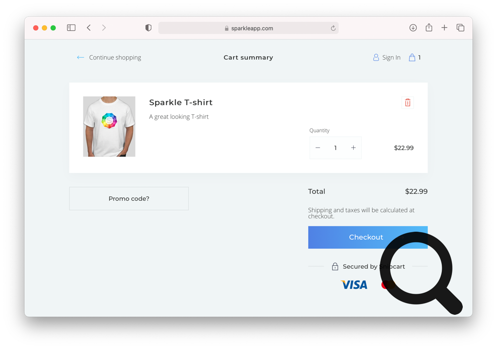 Quand un client ajoute un produit à son panier, celui-ci apparaît dans la page et inclut un parcours de paiement, comme ceci :
