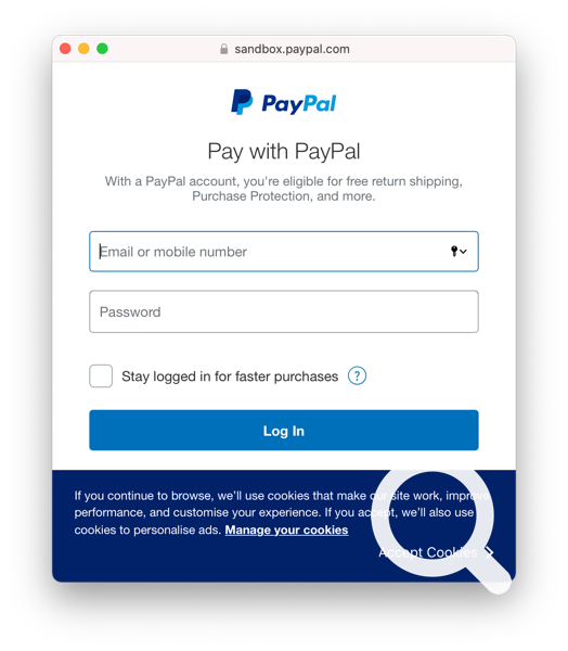 Lorsqu’un client clique sur le bouton PayPal, le paiement est redirigé hors de votre site vers celui de PayPal, où l’achat est finalisé.