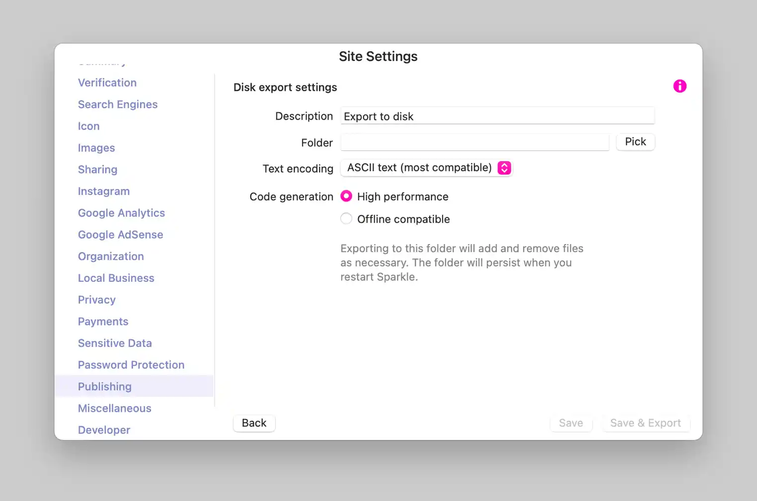 L'exportation sur le disque est simple. Il vous sera demandé de choisir un dossier et de nommer l'emplacement. De plus, vous pouvez choisir l'option d'encodage du texte pour représenter les caractères non-ASCII dans le code de la page Web. Par défaut, Sitely utilise prudemment le texte ASCII, mais vous pouvez le régler sur UTF-8 pour une source de page plus compacte si votre serveur est compatible.