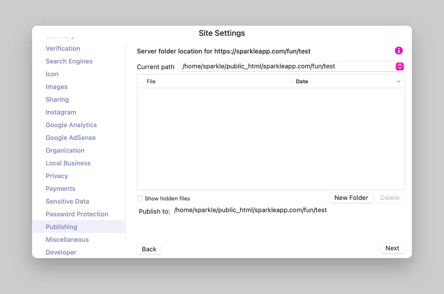 Un emplacement de publication stocke tous les paramètres, ce qui rend la mise à jour du site aussi simple qu'un simple clic. Sitely utilise également ces informations d'emplacement pour ne publier que les fichiers qui ont réellement changé.